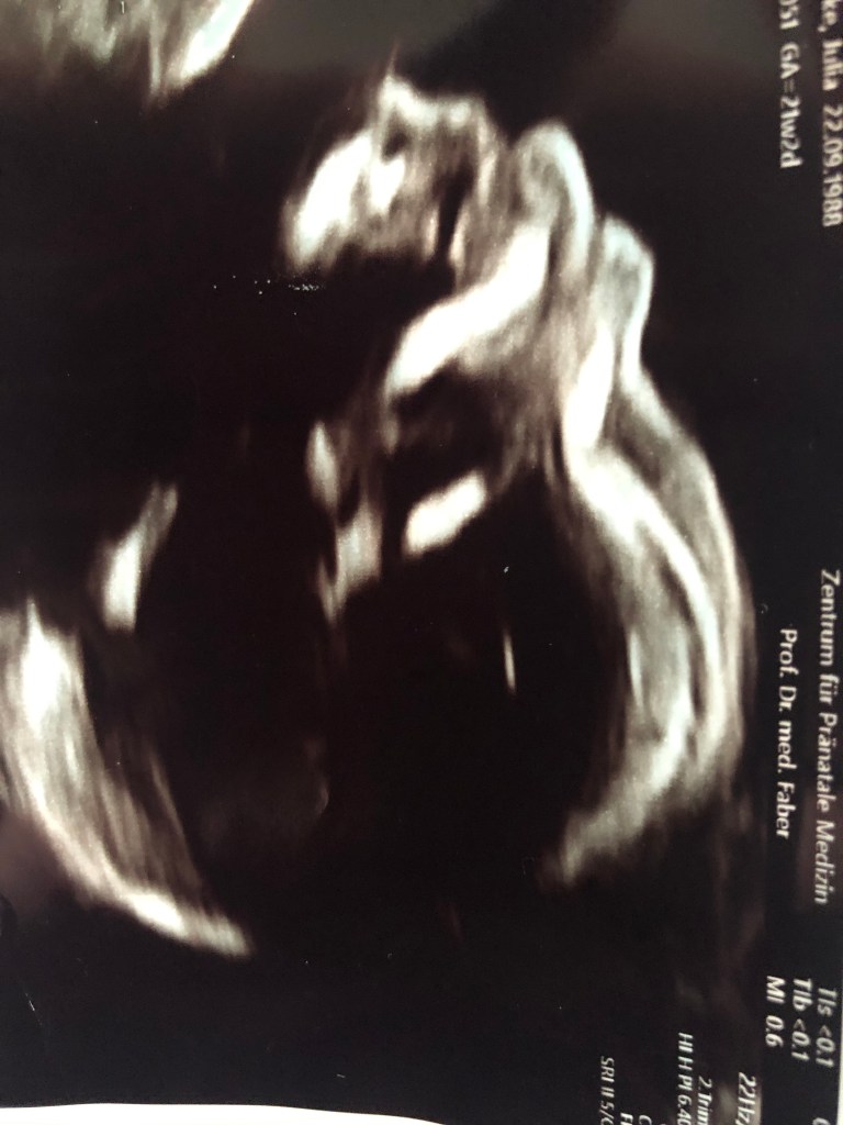 Bei der 2. Untersuchung 4 Wochen später schaute mein Arzt ziemlich lange auf den Bildschirm. Irgendwie klopfte plötzlich mein Herz bis zum Hals. Warum? Reden sie doch mit mir, schoss mir durch den Kopf. Leni hatten wir bis Dato immer noch nichts gesagt, wir haben uns dazu entschlossen, die ersten Wochen abzuwarten. Dem Arzt fiel auf, dass unser kleiner Frosch nicht gewachsen ist. „Das Baby ist viel zu klein für diese Woche.. Mir rollten die ersten Tränen über das Gesicht. „Machen sie sich vorerst mal keine Sorgen“ sagte er und streichelte dabei über meinen Arm. Nach meinem Termin, lief ich aus der Praxis, mit tausend Gedanken in meinem Kopf. Wie soll ich mich jetzt gegenüber Tobias und meiner Familie verhalten? Sollte ich erst einmal alles für mich behalten? Brauche ich aber vielleicht jemanden zum reden? Ich entschloss mich dazu die Kirche im Dorf zu lassen und verdrängte es in meinen Hinterkopf. Ich streichelte über meine kleine Kuller und sagte immer wieder: „wir schaffen das“ und genau so sollte es auch sein. 4 Wochen später zum nächsten Termin hatte der kleine Frosch aufgeholt, aber wie! Plötzlich waren wir wieder voll in den Wochen drin. Größe und Gewicht waren super. Der Arzt war zufrieden und ich beruhigt. Doch was war vorher in der Zeit passiert, als er nicht mehr gewachsen ist? Darüber machte ich mir keine Gedanken. Jetzt wissen wir, was der kleine Frosch getrieben hat in der Zeit. Meine Schwangerschaft verlief ab da an blendend, ich fühlte mich wohl, ich fühlte mich schön, ich war rundum zufrieden. Als der Bauch dann richtig wuchs, kauften wir Leni ein T-Shirt, auf dem stand: •ich werde eine große Schwester•.. sie war so glücklich, ihre Augen strahlten, plötzlich sagte sie klar heraus: „aber ich nehme nur eine Schwester..“ oh,dachte ich, das kann ja noch lustig werden.😊 Leni verriet nun überall, dass sie große Schwester wird. Niedlich! Sie war sooo stolz. Wir freuten uns alle, bis der Tag der Feindiagnostik kam..